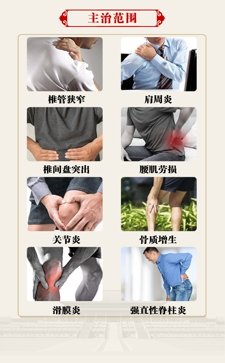 • 椎管狹窄癥、腰椎間盤突出膨出、頸椎病、骨性膝關節炎、膝關節創傷性滑膜炎、類風濕性關節炎、強直性脊柱炎、股骨頭壞死、關節強直、第三腰椎橫突綜合征、髂腰韌帶損傷、頭頸軀干部位軟組織損...